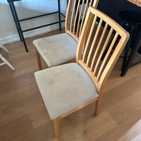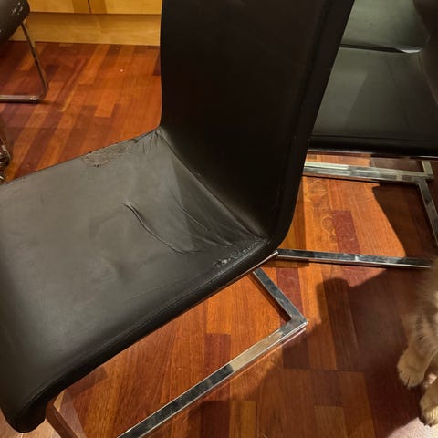 5 spisebord stoler gis bort. Skinnet har begynt å flasse, noen stoler er verre en andre.