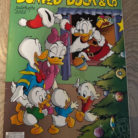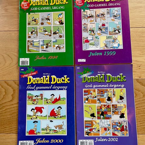 Donald Duck samlepakke bestående av flere Donald Duck bøker og tegneserier, inkludert julebøker, samt ett Donald Duck kosedyr og en rund pute med Donald Duck motiv. Produktene har ulike størrelser og farger, med hovedtemaer relatert til Donald Duck universet.