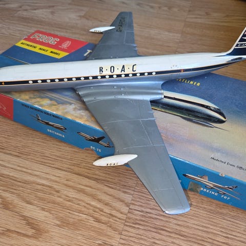 Beechcraft C55 Baron Dinky Toys i metall. Modellen er hvit med gule detaljer og har to motorer. Laget av Meccano Ltd i England. Passer som samlerobjekt eller til utstilling.