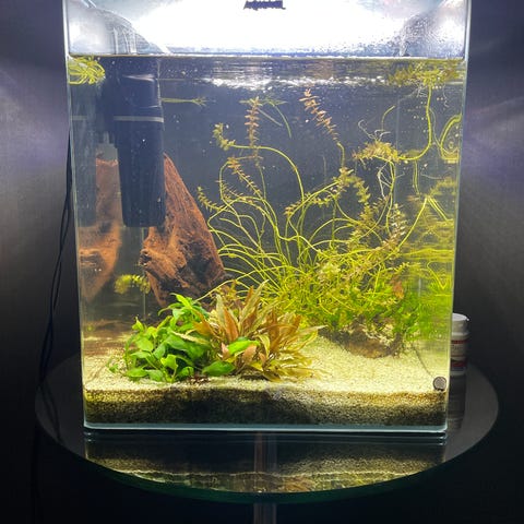 Glassakvarium med sekskantet form. Inkluderer slange og pumpe for vannbytte. Egnet for mindre akvariefisk eller som terrarium for små dyr. Fargen på rammen er svart. Følger med planter og grus. Pris kan diskuteres