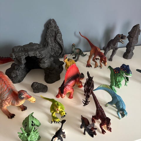 Samling av ulike lekefigurer og leker som inkluderer dinosaurer, biler, og forskjellige figurer. Lekene er av varierende størrelse og materiale, egnet for barn til lek og samling. Dinosaur-roboten fungerer som den skal. Selges samlet. Sendes ikke.