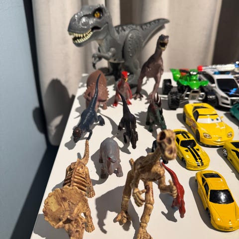 Samling av lekefigurer med dinosaurer, biler og diverse actionfigurer