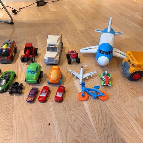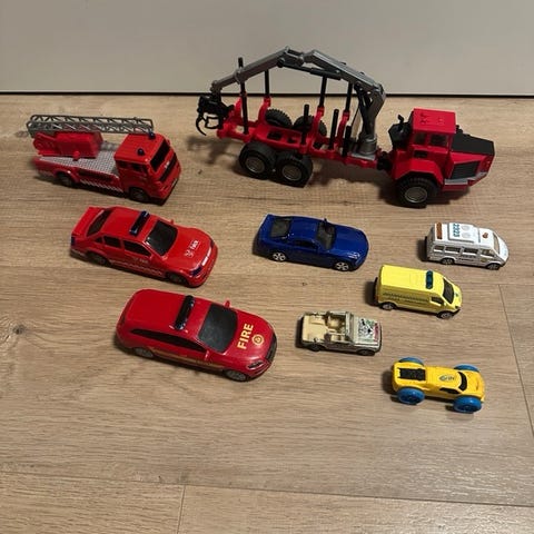 lekebiler bestående av flere små kjøretøy inkludert en brannbil. Alle fungerer som de skal.