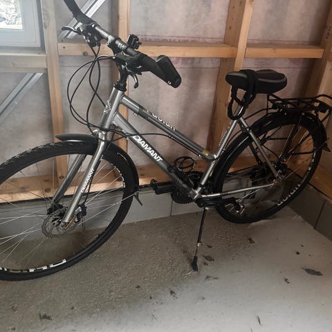 Sykkelen har klossbremser foran og bak - samt skjermer foan og bak- flaskeholder- støtte