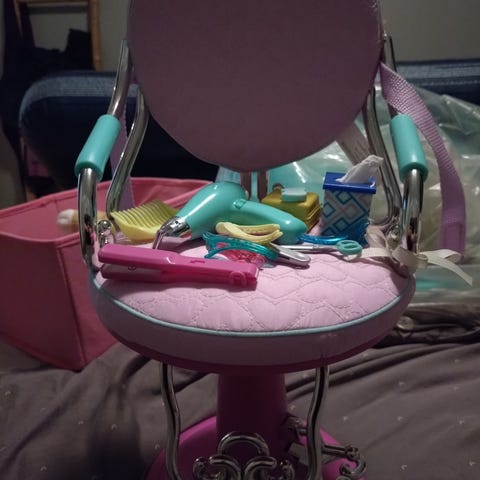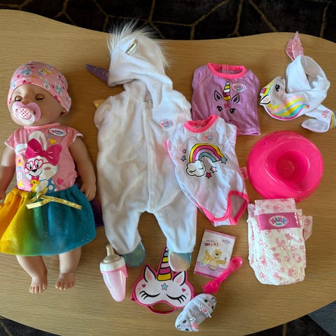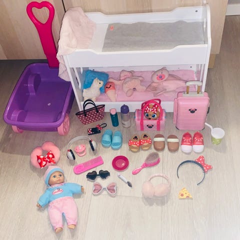 Blond dukke med flere sett klær og sko. Moped med hjelm. Pet Paws veterinærklinikk med utstyr og en hund. Selges samlet. Sendes ikke.