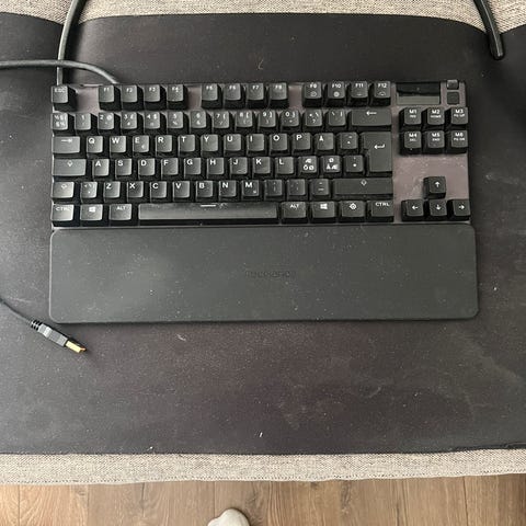 Pent brukt Apex pro tkl fra Steelseries . Kjøpt jul 2023. 3 av tastene lyser en annen farge enn de andre, men alt fungerer utmerket. Leveres med ledning og orginaleske.