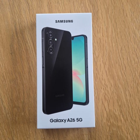 Samsung Galaxy A26 5G mobiltelefon med 128 GB lagringskapasitet. Enheten er i fargen svart og støtter 5G-nettverk.