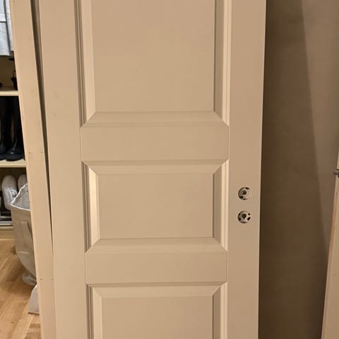 Hvit tredør med klassisk paneldesign, egnet for innendørs bruk. Døren har to låsehull og en enkel, robust konstruksjon. Passer til ulike bolig- og romløsninger.