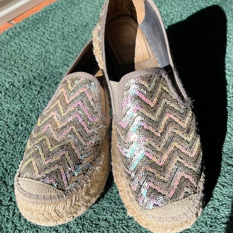 Espadrillos med snøring med 12 cm platå hæl str 38 ?