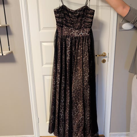 Jeg tilbyr en vakker ballkjole fra LKW Design i en elegant, mørkeblå nyanse. Kjolen er pyntet med dekorative steiner som glitrer vakkert i lyset, samt delikat tyll som gir kjolen letthet og eleganse. Kjolen har størrelse 28 (europeisk S), men takket være snøring i ryggen passer den også til størrelse M. Kjolen er i perfekt stand og er et ideelt valg for ball, studenterfest eller en annen spesiell anledning.