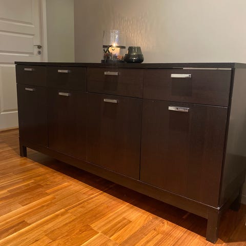 En flott renovert skjenk som har fått en flott finish svart farge med messing bein. Noen bruksmerker som kommer med gammel møblement. Forandrer ikke noe på den sjarmerende vintage stilen. Blir et flott blikkfang i et hvert rom. Solid og tungt møblement.