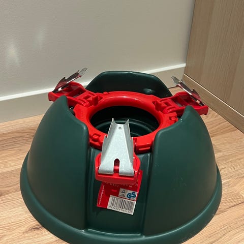 Visstnok en testvinnende juletrefot. Brukt en gang og etter det har vi kjørt juletre av plast.