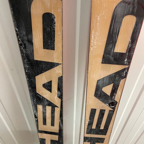 Skiene har synlig bruksslitasje etter normal bruk, men alt fungerer som det skal.