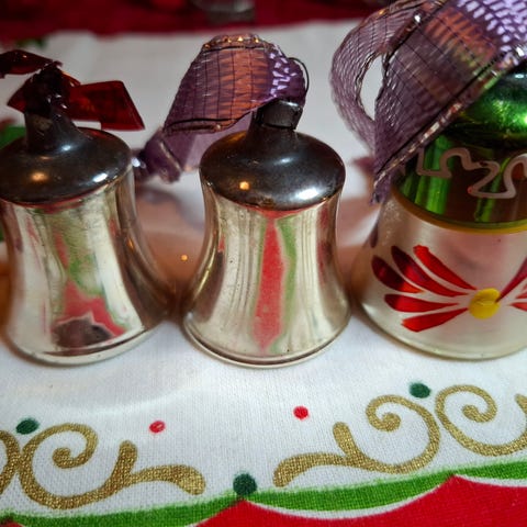 Gamle julepynt laget av munnblåst glass i form av kongler med gullfarget overflate. Hvert ornament er ca. 15 cm langt og har en metallkrok for oppheng. Passer til dekorasjon av juletre eller andre juledekorasjoner.De er fra 1900-1950 tallet. Kr 250 stk
