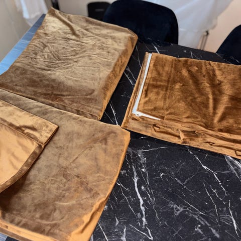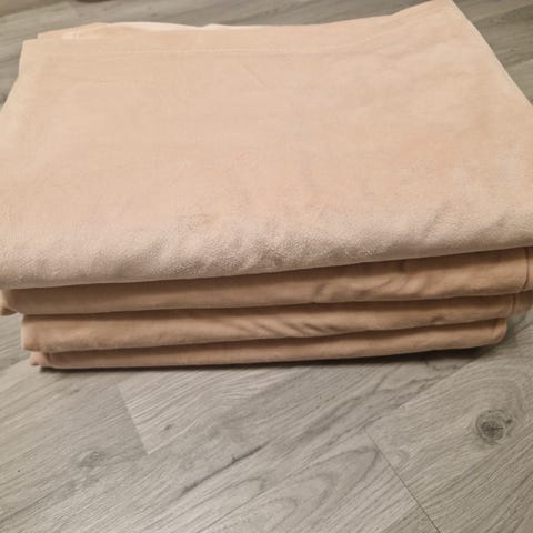4 gardiner i rustrød fløyel fra Rusta selges samlet kr 350