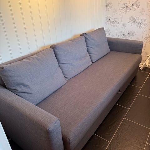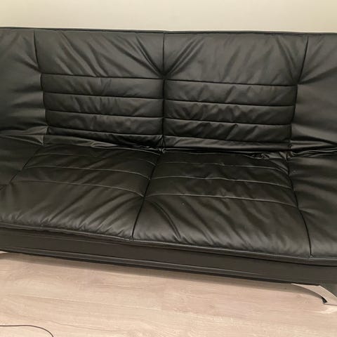 Sovesofa med svart Bomstad trekk. Sofaen kan konverteres til seng, og har oppbevaringsplass under setet. Passer for bruk i stue eller gjesterom.