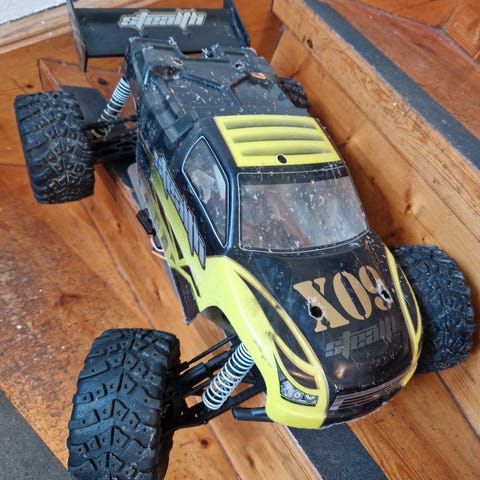 Radiostyrt bil med fire store gummidekk, inkludert lader og fjernkontroll. Passer til bruk innendørs og utendørs.