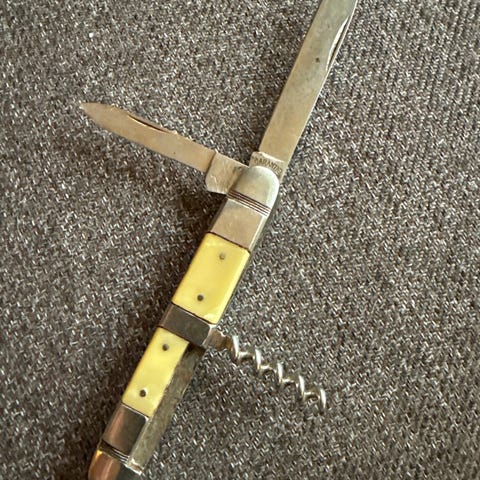 Lommekniv fra Solingen, tysk. Kanskje Hubertus og Skaft av hjortehorn men ikke sikker om det, jeg er ikke kjent med det.