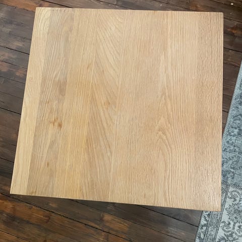 Selger et solid og pent sofabord laget av laminert naturtre. Bordplaten består av sammenlimte trestaver, ikke én massiv treplate, noe som gir god stabilitet og mindre risiko for sprekk.