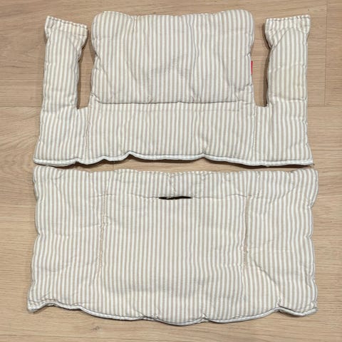 Et pent stripet Stokke putesett med god polstring. Ryggputen passer ikke på nymotens Baby Set i plast, men kan enkelt festes rett på stolen, uansett stolens alder. Sitteputen alene kan kombineres med Baby Set i plast. Hele settet passer i kombinasjon med trebøyle og skinnrem.
