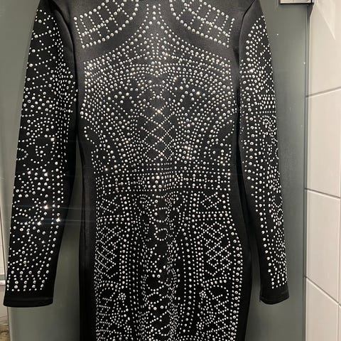 Kjolen sitter veldig godt, gir deg en god figur. Tynt for, lang dekorativ glidelås bak, gjennomsiktig tynt stoff m prikker utgjør de lange ermene. lengre bak, Mid lang. Super kjole til juleselskap eller til nyttårsfesten. :-)