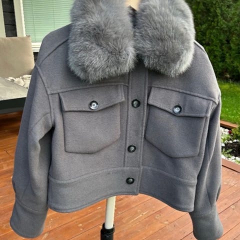 Grå meotine kåpe i ull. Fint brukt. Pris kan diskuteres ved raskt kjøp. Strl xs/s