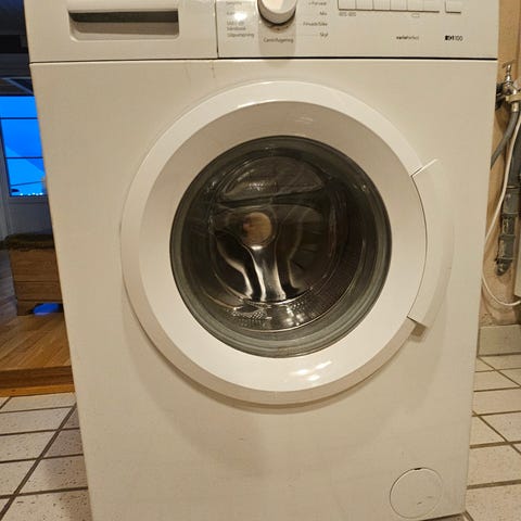 Siemens Frontmatet vaskemaskin med flere vaskeprogrammer inkludert bomull, forvask, sensitiv og sport. Har en digital skjerm og mekanisk kontrollknapp for valg av programmer.