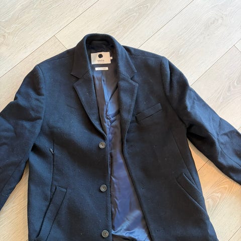Elegant og tidløs herrefrakk fra J. Lindeberg i størrelse 48. Klassisk mørkeblå farge, med diskré og stilren design. Jakken har høy krage, knappelukking og pene snitt som passer perfekt til både formelle anledninger og hverdagsbruk.