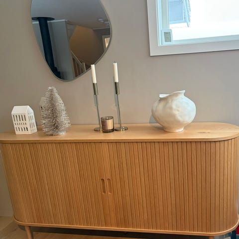 Selger min HASLUND skjenk fra jysk, med tungt hjerte grunnet flytting✨. Skjenken er i veldig pen, lys eik, og har veldig god plass til oppbevaring!