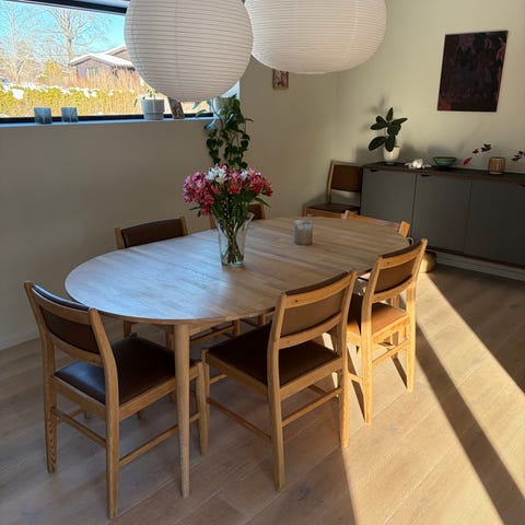 Spisebord i heltre eik (200x100) + ileggsplate og stoler