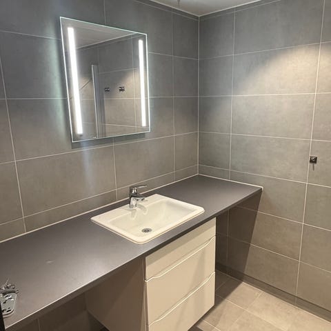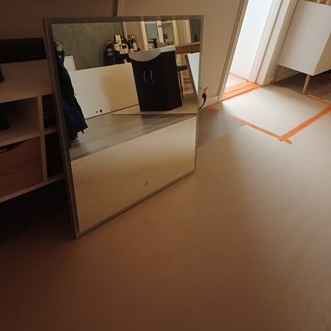 Baderomsspeil med lys (side og underbelysning) 80 cm bred. Varmekabler i speil som hindrer dugg. To stikkontakter på undersiden. Bruker 3 stk lysstoffrør