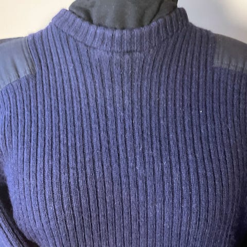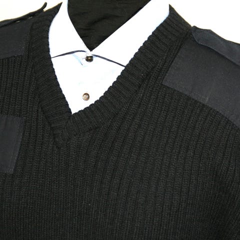 Armygenser i størrelse XXS for barn (32"), laget av 100% ull. Genseren er svart og har albue- og skulderbeskyttelse i bomull. Passer til bruk som varm og slitesterk overdel. Stilen er «Commando sweater» army i ribbestrikket mønster.