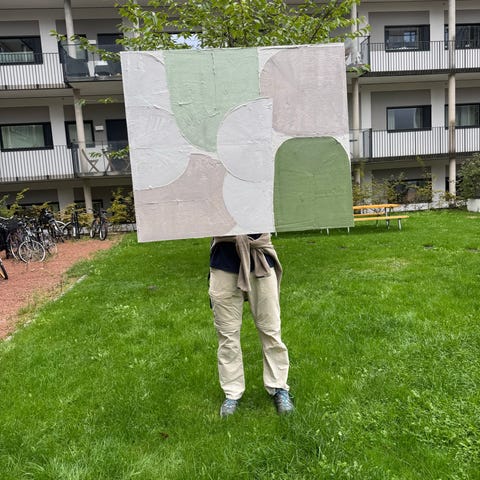 Jeg er selv kunstneren. Dette maleriet er 120x150. Det er malt med akrylmaling på lerret, og det er uten ramme.