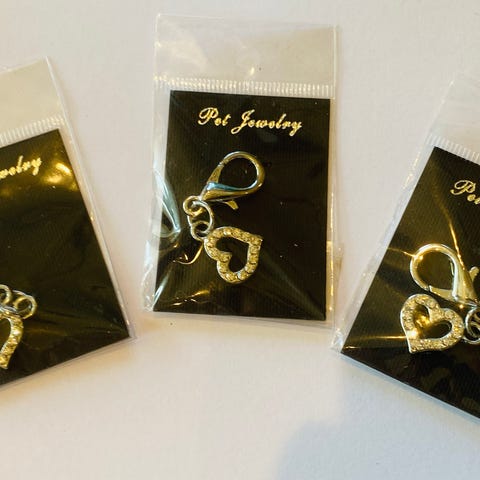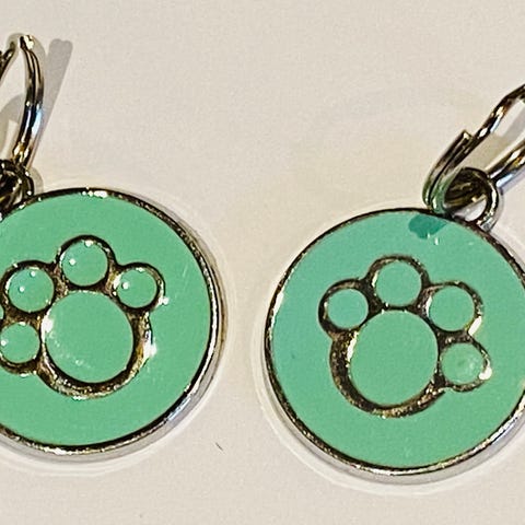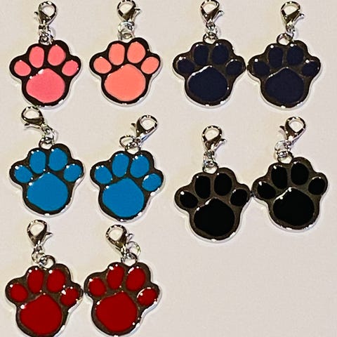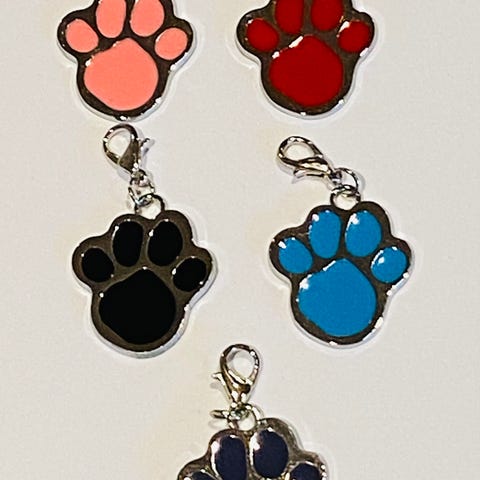 Nøkkelringer/ charms til halsbånd formet som poter med metallramme og lillafarget «emalje». Hver nøkkelring har en krok for enkel feste.