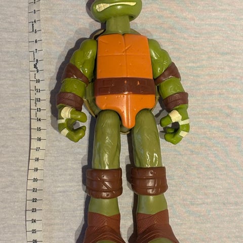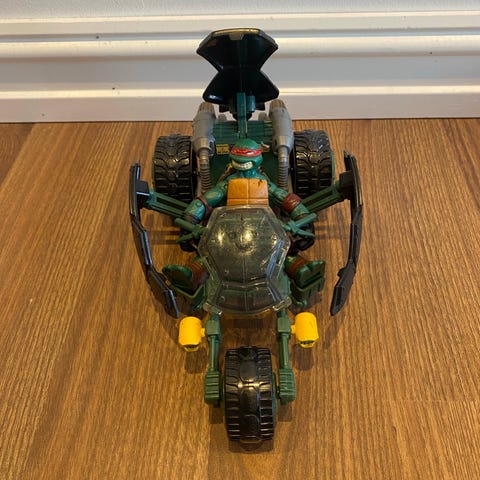 Sett med figurer fra Teenage Mutant Ninja Turtles inkludert flere skilpaddefigurer. De minste er Ninja in training. Settet inneholder også et grønt Turtle kjøretøy med detaljerte deler. Se tekst under bilder.