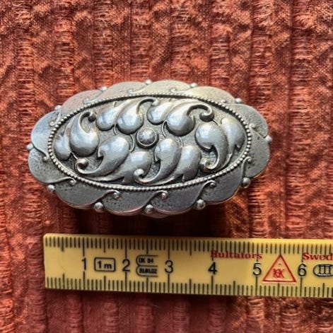 Elegant og tidstypisk skjerfklips fra 1960-tallet, laget i Vest-Tyskland. Klipset har en rund form og er utført i sølvfarget metall, montert på en vakker perlemorbakside (MOP – Mother of Pearl). Dette er et klassisk tilbehør som kombinerer funksjonalitet med vintage stil, perfekt for å løfte ethvert antrekk.