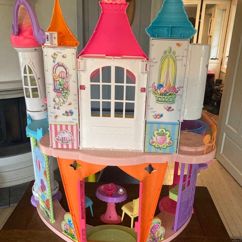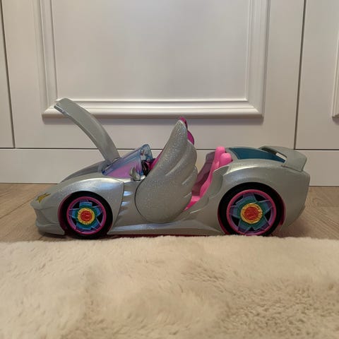 Barbie lekebil som kan foldes ut for lekeplass til hundene og enkelt slås sammen igjen for at barbie kan kjøre videre..