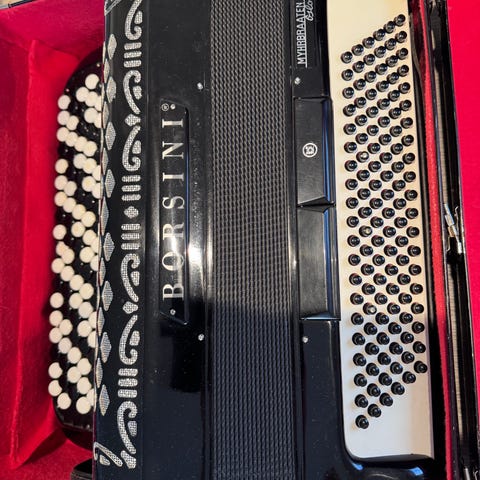Nydelig trekkspill fra kjente Italienske Castelfidardo. Som ny, 5 registre og 96 basser. Flere deler i treverk for en fin klang.