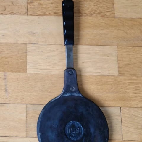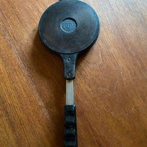 Jøtul krumkakejern i støpejern med dekorativt mønster. Egnet for bruk på komfyr eller over åpen flamme. Tradisjonelt design for å lage krumkaker
