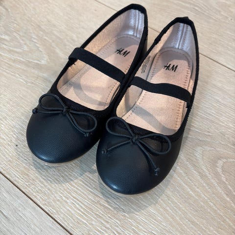 H&M pensko/ ballerinasko for barn i størrelse 30, designet for jenter. Skoene er svarte med en elastisk stropp over vristen for bedre passform. Litt slitasje på tuppen av den ene skoen, se bilde