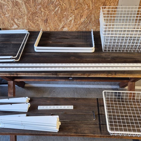 Elfa decor oppbevaringssystem bestående av modulære hvite skuffer og hyller. 10 stk hyller med knekter, 6 skuffer med tråkurver og et speil. Alle knekter følger med. Kjøpte dette brukt selv, men hadde ikke brukt for alt, selger derfor det jeg har til overs billig. Dette er elfa decor. Dekorlister følger også med. Det du trenger å kjøpe er stenger som knekter henges på. Kan hentes i hele jula.