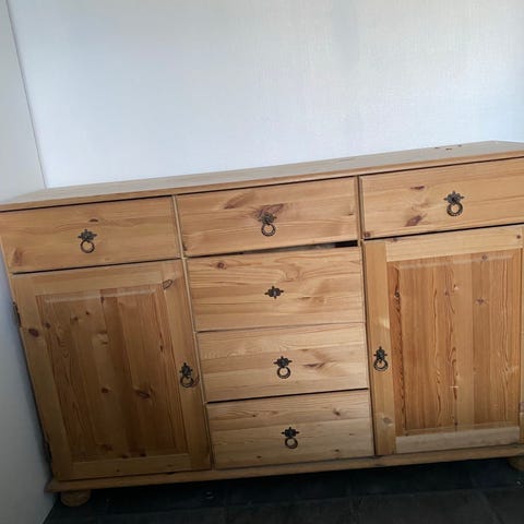 Eldre skjenk av solid furu gis bort. Synlig brukt og en av håndtakene er løs. Målene er ca 44 (B)x60 (H)x137 (L)