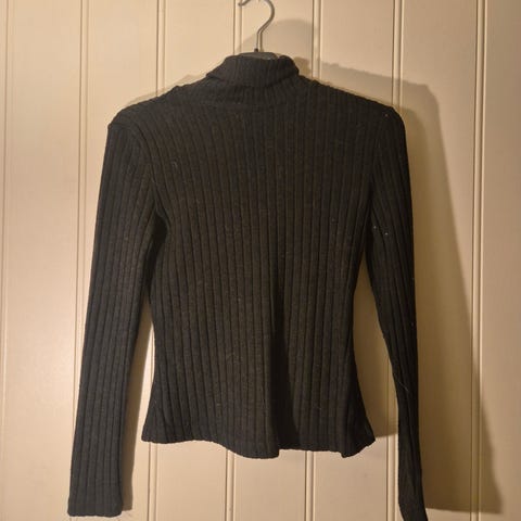 Svart genser med mønster og innsvinget i livet. Strl M.