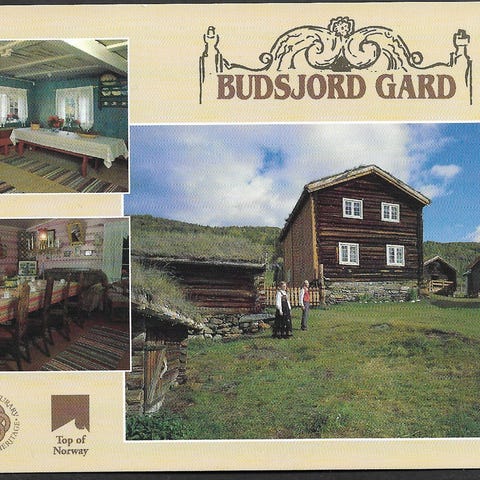 Postkort med motiv av Jørungard i Nord-Sel. En rekonstruert middelaldergård til filmen Kristin Lavransdatter. Strøkent, ubrukt A6-format. Se bilder