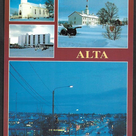 Postkort med bilder fra Hammerfest, inkludert byens kirke, fontene og havneområde. Strøkent, ubrukt A6-format. Se bilder