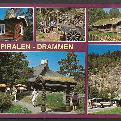 Postkort med flere motiver fra Spiralen i Drammen. inkludert utsikt over by, skulpturer og natur. Strøkent, ubrukt A6-format. Se bilder