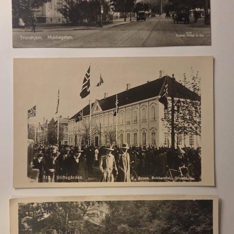Postkort med motiv av Nidarosdomen i Trondheim. Kortet viser et detaljert bilde av katedralen med omkringliggende bygninger og landskap. Strøkent, ubrukt A6-format. Se bilder