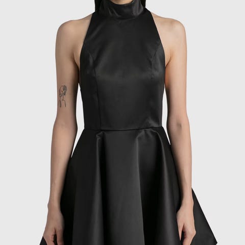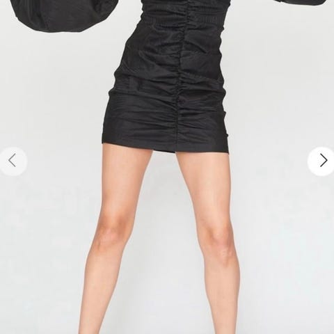 Velvet Bow Mini Dress fra ROTATE Birger Christensen. En dramatisk og sofistikert kjole laget i luksuriøs sort fløyel. Kjolen har lange ermer og høy hals som balanseres av den korte lengden. Midjen markeres med en voluminøs satengsløyfe som faller ned i et langt slep. Kjøpt desember 2025.