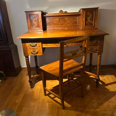 Vintage skrivebord med flere skuffer og innfelt skriveflate i lær med gullfarget dekor. Følger med en tilpasset stol i tre med polstret sete i stripet stoff. Passer til kontor eller arbeidsrom.Mål bredde ca 60, lengde 1.20 og høyde 77.Noe riper.