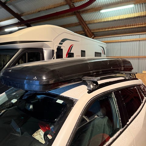 Skiguard 825 takboks med whispbar lavtliggende fester. Står montert på en mazda cx-5 nå, men dimensjonene passer kanskje andre biler også.